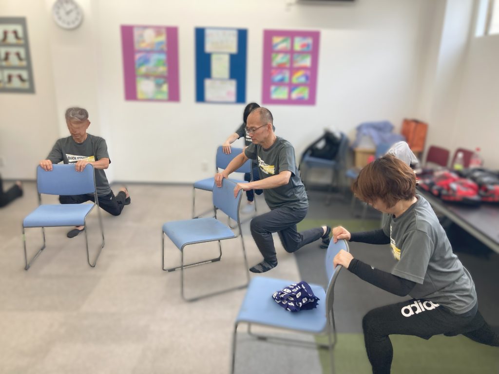 本日は、普段よりも椅子を使用した運動を多めにして、一つの一つの動きの確認。皆さんに得手不得手を感じてもらいながらの準備体操と運動を行いました!