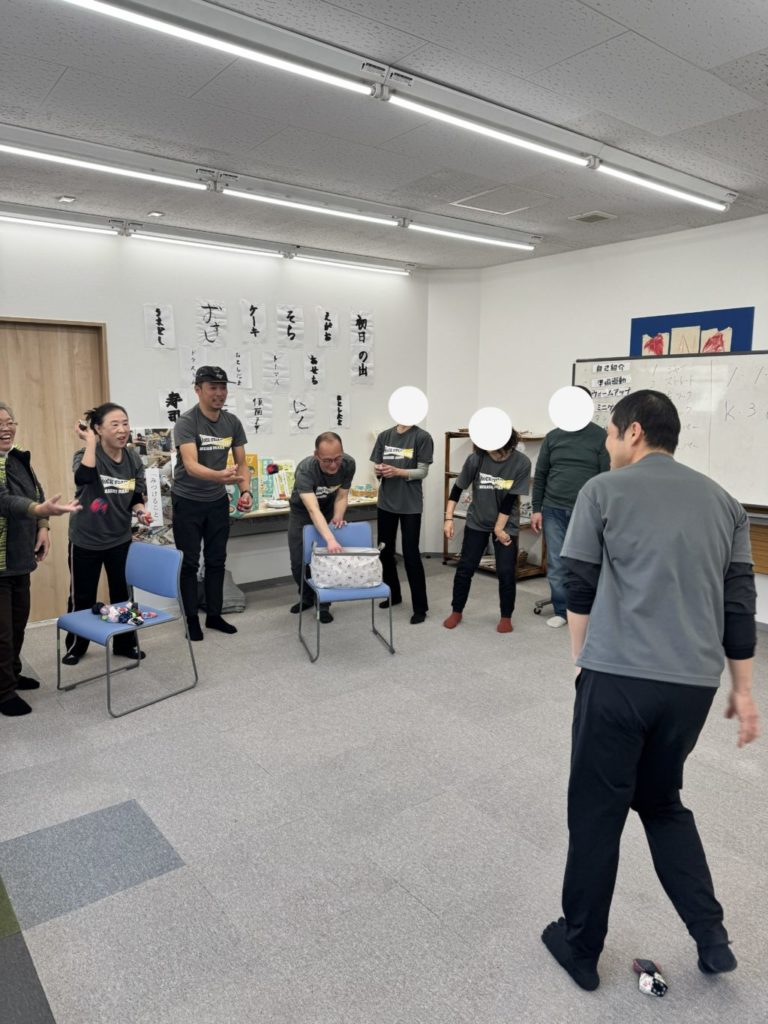 そして後半は、皆様お待ちかねの(?)逆襲タイム!「当てるぞ~~~!」っと気合の掛け声とともに、必死で逃げ回る私たち(コーチ)めがけてお手玉をフルスイング!狙い打つ皆様の表情は、今日一番の笑顔(と真剣な眼差し)でした。